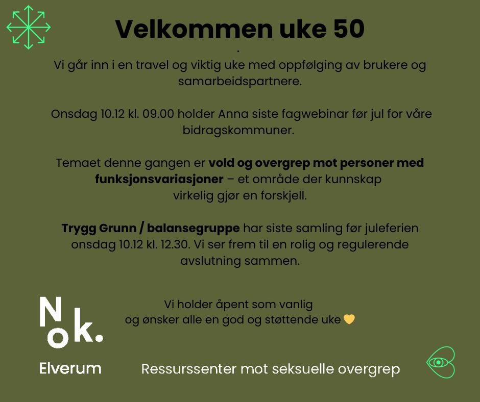 Vi holder åpent som vanlig og ønsker alle en god og støttende uke. Merk at senteret har juleferie mellom 22.12 og åpner mandag 05.01.2026