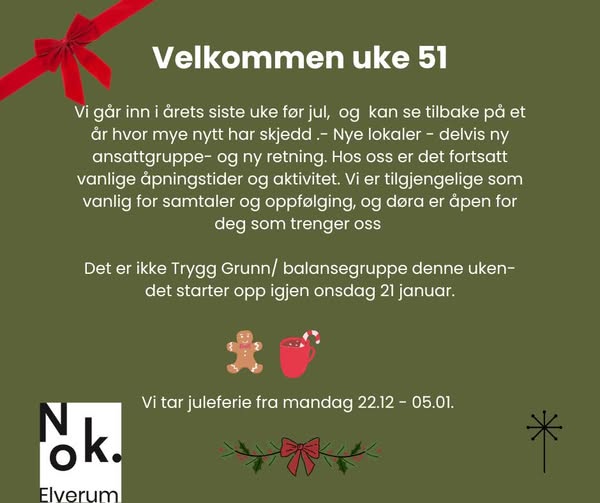 Vi er tilgjengelige som vanlig for samtaler og oppfølging, og døra er åpen for deg som trenger oss i førjulstida. Vi ønsker alle en så god og rolig avslutning på året som mulig ![]()