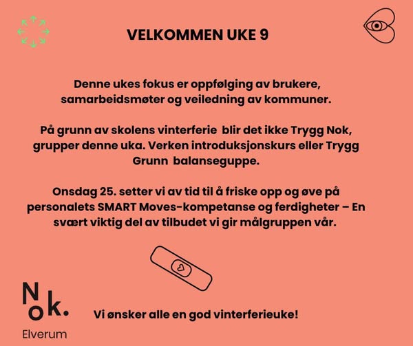 På grunn av skolens vinterferie blir det ikke Trygg Nok. introduksjonskurs eller Trygg Grunn balanseguppe denne uken.