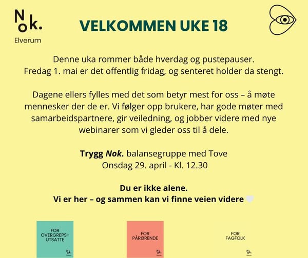 Denne uka rommer både hverdag og pustepauser.Fredag 1. mai er det offentlig fridag, og senteret holder derfor stengt.